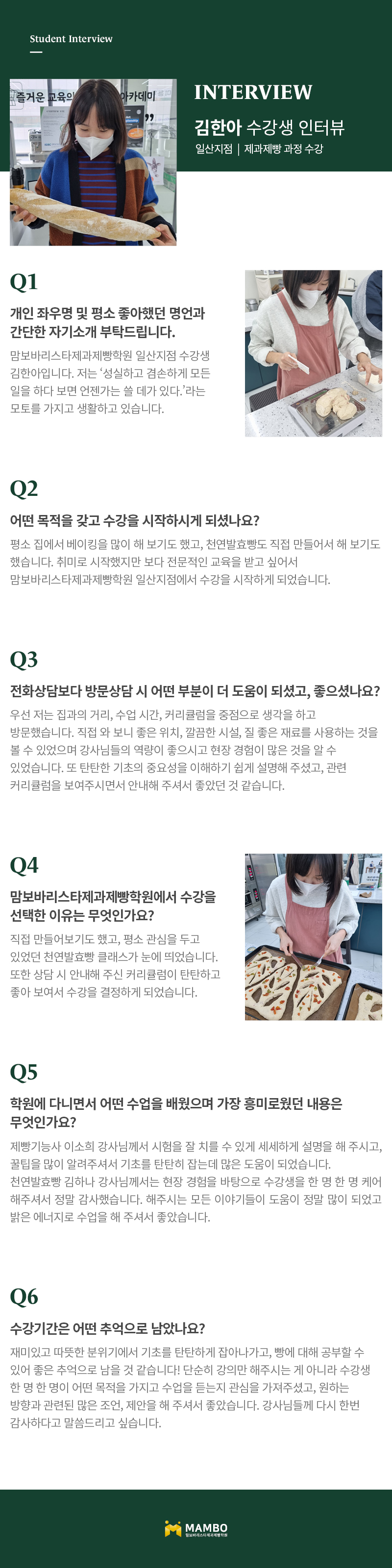 제1조 (개인정보 수집에 대한 동의)맘보교육그룹(이하 회사)는 이용자들이 회사의 개인정보취급방침 또는 이용약관의 내용에 대하여 “동의”버튼 또는 “취소”버튼을 클릭할 수 있는 절차를 마련하여, “동의”버튼을 클릭하면 개인정보 수집에 대해 동의한 것으로 봅니다. 제2조 (개인정보 수집항목) 온라인 문의를 통한 상담을 위해 처리하는 개인정보 항목은 아래와 같습니다. 수집항목 : 성명, 이메일, 전화번호 제3조 (개인정보의 이용목적) 회사는 이용자의 사전 동의 없이는 이용자의 개인 정보를 공개하지 않으며, 원활한 고객상담, 각종 서비스의 제공을 위해 아래와 같이 개인정보를 수집하고 있습니다. 모든 정보는 상기 목적에 필요한 용도 이외로는 사용되지 않으며 수집 정보의 범위나 사용 목적, 용도가 변경될 시에는 반드시 사전 동의를 구할 것입니다. - 성명 : 제품상담에 따른 본인 확인 - 이메일, 전화번호 : 제품상담 및 이벤트 관련 고지사항 전달, 새로운 서비스 및 신상품 정보 제공(DM, SMS, 이메일 등 이용) 이용자는 개인정보의 수집/이용에 대한 동의를 거부할 수 있습니다. 다만, 동의를 거부하는 경우 온라인 문의를 통한 상담은 불가하며 서비스 이용 및 혜택 제공에 제한을 받을 수 있습니다. 제4조 (개인정보의 보유 및 이용기간) 원칙적으로 개인정보 수집 및 이용목적이 달성된 후에는 해당 정보를 지체 없이 파기합니다. 그리고 상법, 전자상거래 등에서의 소비자보호에 관한 법률 등 관계법렵의 규정에 의하여 보존할 필요가 있는 경우 회사는 관계법령에서 정한 일정한 기간 동안 정보를 보관합니다. 이 경우 회사는 보관하는 정보를 그 보관의 목적으로만 이용하며 보존기간은 아래와 같습니다. - 계약 또는 청약철회 등에 관한 기록 : 5년(전자상거래등에서의 소비자보호에 관한 법률) - 소비자의 불만 또는 분쟁처리에 관한 기록 : 3년(전자상거래등에서의 소비자 보호에 관한 법률) - 시용정보의 수집/처리 및 이용 등에 관한 기록 : 3년(신용정보의 이용 및 보호에 관한 법률) - 회사는 귀중한 이용자의 개인정보를 안전하게 처리하며, 유출의 방지를 위하여 다음과 같은 방법을 통하여 개인정보를 파기합니다. - 종이에 출력된 개인정보는 분쇄기로 분쇄하거나 소각을 통하여 파기합니다. - 전자적 파일 형태로 저장된 개인정보는 기록을 재생할 수 없는 기술적 방법을 사용하여 삭제합니다.